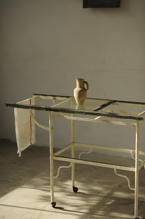 [ クリップライトと木製フレームと白いワゴン ]
